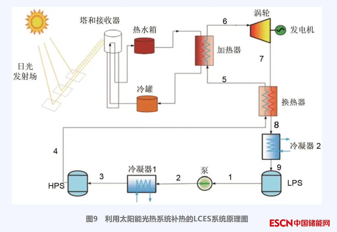 文獻[33]提出了一種利用太陽能光熱系統(tǒng)補熱的LCES系統(tǒng),如圖9所示,該系統(tǒng)在透平入口前引入額外的光熱熱源,在透平出口設(shè)置回?zé)崞骰厥?00 ℃二氧化碳的余熱,從而提高了透平進口溫度。與常規(guī)LAES系統(tǒng)相比,該系統(tǒng)具有較高的循環(huán)效率和?效率。但需要注意的是,該系統(tǒng)需要控制太陽熱量的波動以減小對LCES系統(tǒng)透平進口溫度穩(wěn)定性的影響。