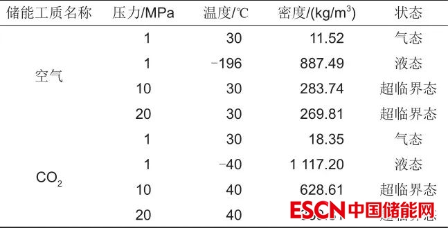 為了進一步提高儲能系統(tǒng)的儲能效率與能量密度,相關(guān)學(xué)者提出了以CO2為工質(zhì)的二氧化碳儲能(carbon dioxide energy storage,CES)系統(tǒng),由于CO2臨界點(7.39 MPa和31.4 ℃)相對空氣(3.77 MPa和-140.5 ℃)容易達到,無毒、不易燃、安全等級為A1,且超臨界二氧化碳(S-CO2)具有優(yōu)良的熱力學(xué)性質(zhì):黏度小、密度大、導(dǎo)熱性能好,系統(tǒng)寄生能耗也相對較低。基于常規(guī)儲能設(shè)計參數(shù),表1展示了不同壓力和對應(yīng)溫度下空氣和CO2的密度大小,可以看出,相同狀態(tài)和壓力下CO2儲存密度均大于空氣,其中液態(tài)儲存時最高,從而使得CES系統(tǒng)具有較高的儲能潛力。