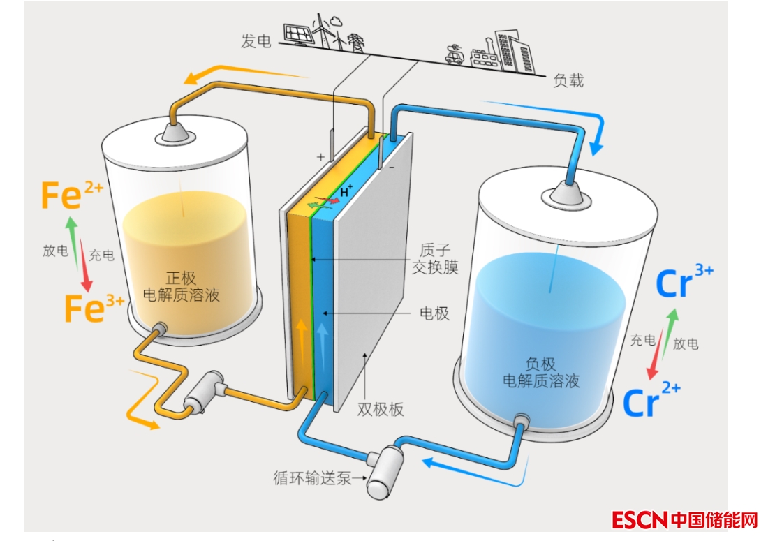 鐵-鉻液流電池儲能技術(shù)被稱為儲能時間最長、最安全的電化學(xué)儲能技術(shù)之一,該技術(shù)的電解質(zhì)溶液為水系溶液,不會發(fā)生爆炸,可實現(xiàn)功率和容量按需靈活定制,且具有循環(huán)壽命長、穩(wěn)定性好、易回收、運(yùn)行溫度范圍廣、成本低廉等優(yōu)勢,完全符合我國大規(guī)模、長時間儲能需求的新型電力系統(tǒng)。