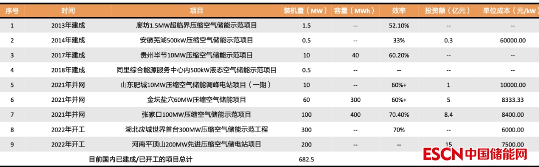 已建成/已開工的九個項目分別是:安徽蕪湖500kW壓縮空氣儲能示范項目、貴州畢節(jié)10MW壓縮空氣儲能示范項目、同里綜合能源服務中心內(nèi)500kW液態(tài)空氣儲能示范項目、山東肥城10MW壓縮空氣儲能調(diào)峰電站項目(一期)、金壇鹽穴60MW壓縮空氣儲能項目、張家口100MW壓縮空氣儲能示范項目、湖北應城世界首臺300MW壓縮空氣儲能示范工程、河南平頂山200MW先進壓縮空氣儲電站項目、廊坊1.5MW超臨界壓縮空氣儲能示范項目。