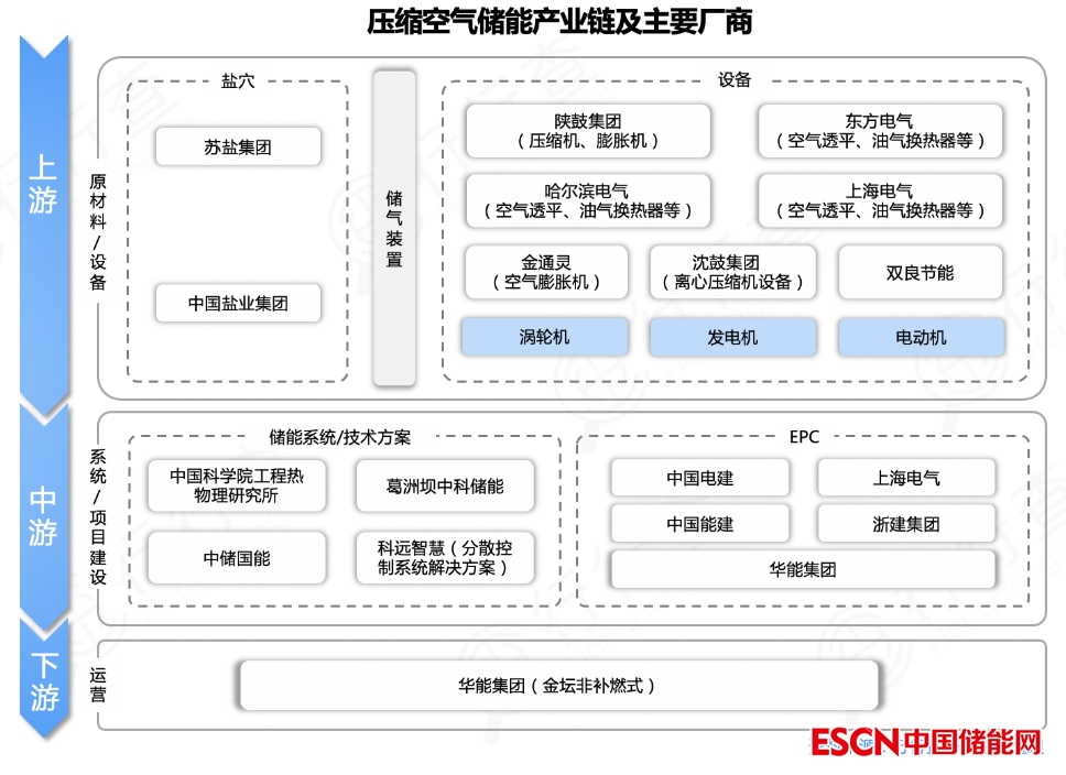 壓縮空氣儲能產(chǎn)業(yè)鏈包括上游裝備制造、儲氣庫;中游儲能系統(tǒng)集成(主要提供技術支持);下游儲能系統(tǒng)安裝為新能源及傳統(tǒng)電站、電網(wǎng)公司、工商業(yè)企業(yè)等終端用戶提供EPC(工程建設總承包)業(yè)務。