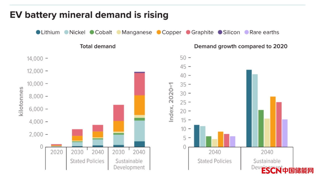 國際能源署預(yù)計,為了實現(xiàn)將全球氣溫上升幅度控制在遠(yuǎn)低于2攝氏度(可持續(xù)發(fā)展方案)的碳排放削減目標(biāo),針對幾種關(guān)鍵礦物的需求將會激增。如果各國只是按照目前的承諾(既定政策)采取行動,需求同樣會增加,只是增速較小。
