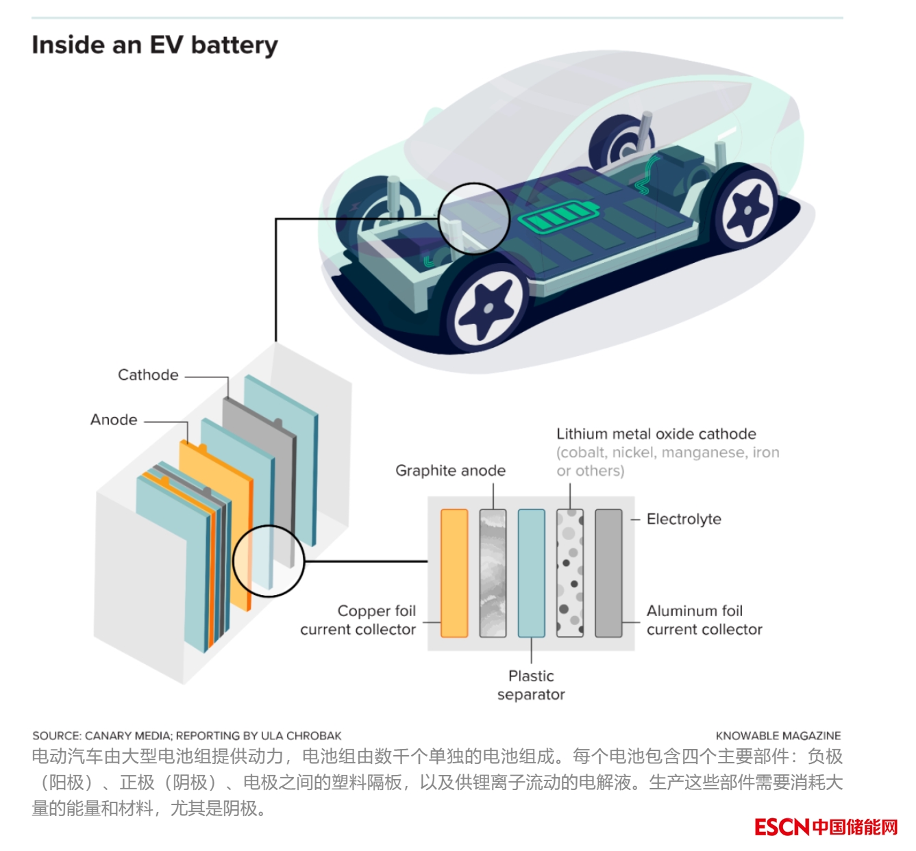 為了給汽車供電,電池中的電子從負(fù)極(即陽極)移動到正極(陰極)。通常情況下,陽極由銅和石墨制成,而陰極由一類稱為鋰金屬氧化物的化合物組成,含有鋰以及鈷、錳和鎳等其他金屬。