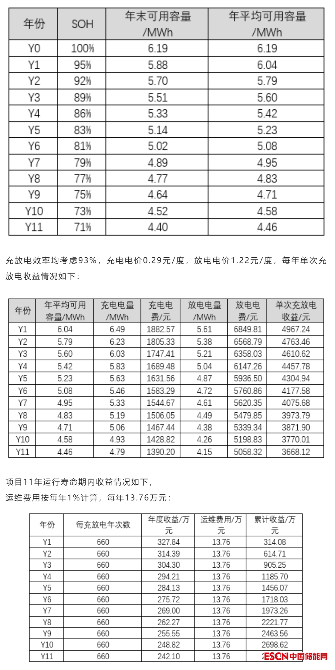 90%DOD 每天2次循環(huán)年運(yùn)行330天,每年660次循環(huán)情況下考慮儲能SOH和可用容量表格如下: