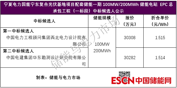中國儲能網(wǎng)訊:近日,寧夏電力國能寧東復合光伏基地項目配套儲能一期100MW/200MWh儲能電站 EPC總承包工程(一標段)中標候選人公示對外發(fā)布。中國電力工程顧問集團西北電力設計院有限公司總報價30308萬元,折合單價1.515元/Wh,成為第一中標候選人。