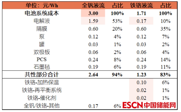 表:全釩電池和鐵鉻電池成本構(gòu)成對比
