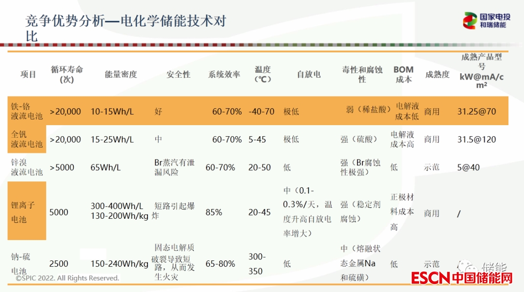 第二,鐵鉻液流電池。電解液為不同價態(tài)鐵離子和鉻離子的鹽酸溶液,主要引領(lǐng)者為國家電投集團(tuán)子公司和瑞儲能。