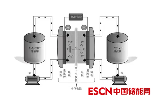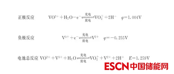 全釩液流電池(Vanadium Redox Battery,VRB),是一種活性物質(zhì)呈循環(huán)流動液態(tài)的氧化還原電池。通過兩個不同化合價的、被隔膜隔開的釩離子之間交換電子來實現(xiàn)電能與化學(xué)能的相互轉(zhuǎn)化。釩電池充電后,正極為 V5+,負(fù)極為 V2+;放電后,正負(fù)極分別為 V4+和 V3+溶液。正極和負(fù)極之間由隔膜隔開,該隔膜只允許 H+通過,,H+也就起到了電池內(nèi)部導(dǎo)電的作用。