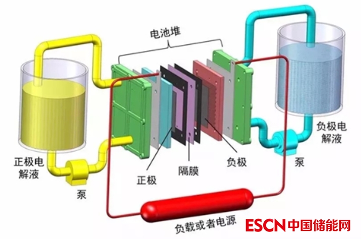 液流電池原理:以化學(xué)能儲存電能。電池充電時,電能被轉(zhuǎn)化成化學(xué)能后存儲在儲液罐的電解液中;電池放電時,電解液中的化學(xué)能被轉(zhuǎn)化為電能。