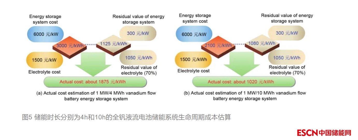 綜上所述,對于儲能時長為4h的全釩液流電池儲能系統(tǒng),初次投資成本約為3000元/kWh,電解液的成本(價格)約占系統(tǒng)總成本的50%;而對于儲能時長為10h的儲能系統(tǒng),初次投資成本約為2100元/kWh,電解液的成本占系統(tǒng)總成本的70%。由于全釩液流電池的電解液可在線或離線再生循環(huán)使用,1kWh電解液約需要8kg高純度的V2O5,所以,釩電解液的殘值很高。電池系統(tǒng)運(yùn)行15—20年報廢后,除電解液可循環(huán)利用外,電堆的電極和雙極板(碳材料)及電極框(塑料)可作為燃料使用,燃燒后只產(chǎn)生CO2和H2O,集流板為銅板,端板為鋁合金板或鑄鐵板,緊固螺桿為鋼材料,電池系統(tǒng)報廢后,很容易回收循環(huán)利用。全釩液流電池儲能系統(tǒng)報廢后,具有很高的殘值,而且回收利用簡單。圖5為儲能時長分別為4h(如1MW/4MWh)和儲能時長為10h(如1MW/10MWh)全釩液流電池儲能系統(tǒng)生命周期的成本估算。對于儲能時長為4h的系統(tǒng),初次投資成本為3000元/kWh,使用15年以上電池系統(tǒng)報廢后,如果電池系統(tǒng)廢金屬的殘值估值為300元/kW,電解液的殘值按70%估算為1050元/kWh,這樣電池系統(tǒng)的殘值為1125元/kWh,實(shí)際成本約為1875元/kWh。而對于儲能時長為10h的儲能系統(tǒng),初始投資成本為2100元/kWh,使用15年以上電池系統(tǒng)報廢后,電池系統(tǒng)廢金屬等的殘值估值為300元/kW,電解液的殘值按70%估算為1050元/kWh,這樣電池系統(tǒng)的殘值為1080元/kWh,實(shí)際成本僅為1020元/kWh。所以,上述分析說明從生命周期角度來講,全釩液流電池除了安全性好、使用壽命長外,還具有性價比高、經(jīng)濟(jì)性好、環(huán)境負(fù)荷低的優(yōu)勢。因此,全釩液流電池是高功率、大容量、長時儲能技術(shù)的最佳選擇。