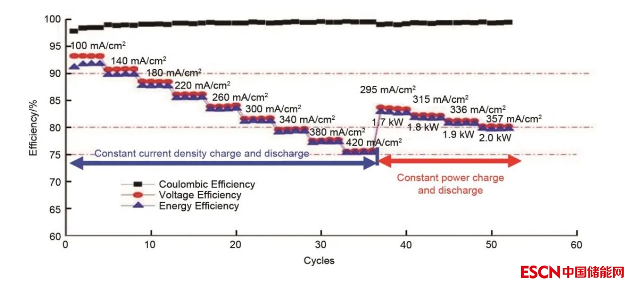 多年來,大連化學(xué)物理研究所—融科儲能合作團(tuán)隊,在電池材料,包括電解質(zhì)溶液、非氟離子傳導(dǎo)膜、碳塑復(fù)合雙極板和電堆結(jié)構(gòu)設(shè)計技術(shù)方面都取得了創(chuàng)新性的技術(shù)突破,開發(fā)出高導(dǎo)電性、高韌性碳塑復(fù)合雙極板,高導(dǎo)電性、高離子選擇性離子傳導(dǎo)膜,同時,通過數(shù)值模擬和實(shí)驗驗證,掌握了高功率密度電堆的設(shè)計方法,大幅度降低了電堆的歐姆極化,從而在保持電堆的充放電能量效率大于80%的前提條件下,電堆的額定工作電流密度大幅度提高。圖3為2kW電堆在恒電流密度和恒功率密度充放電時電堆的庫侖效率、電壓效率和能量效率。在2kW恒功率充放電時,在保持電堆的能量效率大于80%時,工作電流密度345mA/cm2,電堆的功率密度顯著提高,從而大幅度降低了電池的制造成本。