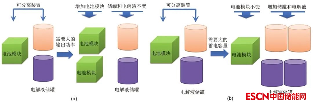 (a)要增加輸出功率,僅需增加電堆的數(shù)量;(b)要增加儲能容量,僅需增加電解液的體積