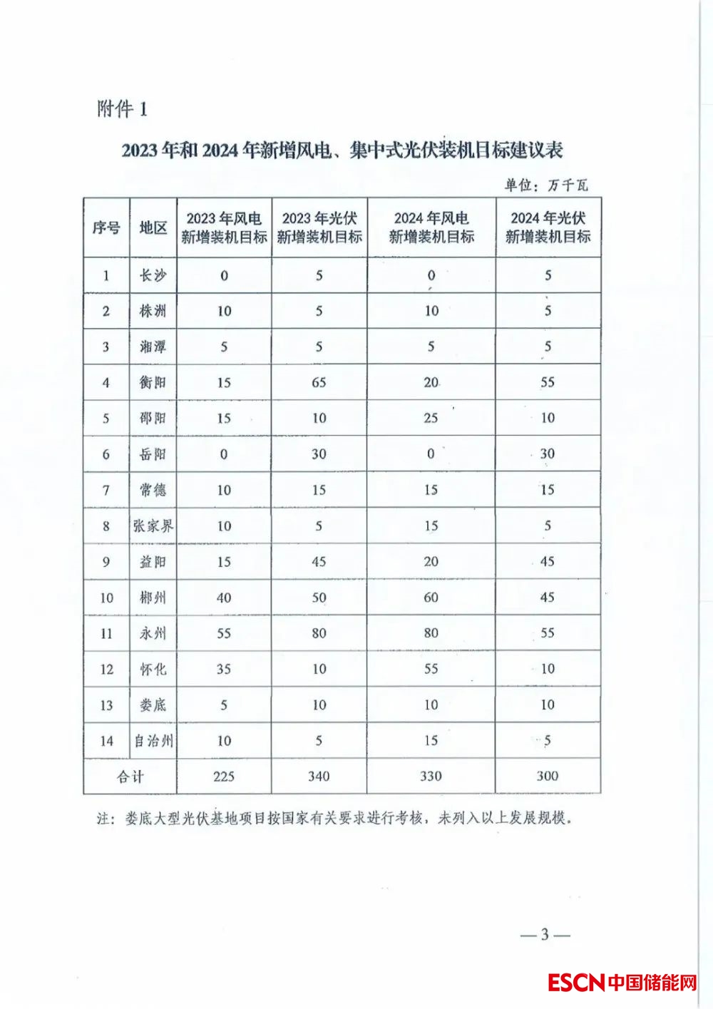 《通知》指出,根據(jù)國家對湖南省2023年、2024年的非水可再生能源消納權(quán)重最低預期值,湖南發(fā)改委測算了2023年和2024年新增風電、集中式光伏最低裝機目標,并結(jié)合資源分布和電網(wǎng)消納能力分解到各市州。其中,2023年湖南新增風電規(guī)模為225萬千瓦,新增光伏裝機規(guī)模為340萬千瓦;2024年湖南新增風電規(guī)模為330萬千瓦,新增光伏裝機規(guī)模為300萬千瓦。