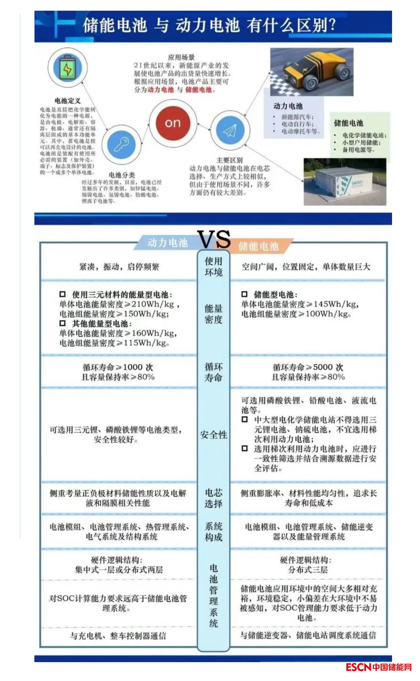 動力電池與儲能電池在電芯種類、技術(shù)原理、供應(yīng)商等方面有較多相似之處,但由于使用場景的不同,現(xiàn)實應(yīng)用對于二者的能量密度、循環(huán)壽命等方面有著不同的要求。