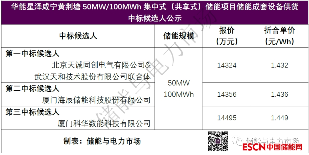中國儲能網(wǎng)訊:近日,華能星澤咸寧黃荊塘50MW/100MWh集中式(共享式)儲能項目儲能成套設(shè)備供貨中標候選人公示對外發(fā)布。北京天誠同創(chuàng)電氣有限公司&武漢天和技術(shù)股份有限公司聯(lián)合體以總報價14324萬元,折合單價1.432元/Wh,成為第一中標候選人。