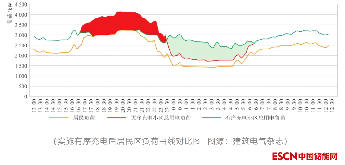 在無(wú)序充電狀態(tài)下,用戶下班回家,充電樁即插即充,充電負(fù)荷和居民用電負(fù)荷幾乎重合。而通過(guò)車(chē)網(wǎng)互動(dòng)技術(shù),可以在用電高峰時(shí)段進(jìn)行小功率的充電,當(dāng)整體的用電負(fù)荷下降之后,再提升用戶的充電功率,從而將用電高峰期時(shí)段的充電量平移至夜間用電低谷時(shí)段。