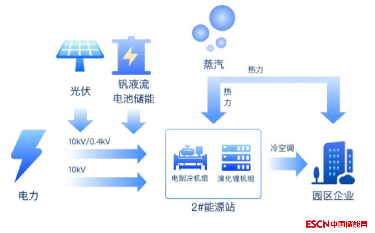 據(jù)了解,杭州醫(yī)藥港位于杭州錢塘下沙片區(qū)北部,規(guī)劃面積3.5平方公里,是杭州市生物醫(yī)藥產(chǎn)業(yè)發(fā)展的核心區(qū)。為更好滿足醫(yī)藥港加速器三期園區(qū)內(nèi)生物醫(yī)藥生產(chǎn)型企業(yè)全年用冷需求,結合雙碳發(fā)展愿景,在錢塘區(qū)發(fā)展改革局、國網(wǎng)杭州供電公司指導下,和達能源公司、國網(wǎng)杭州市錢塘區(qū)供電公司聯(lián)合國網(wǎng)(杭州)綜合能源服務有限公司和浙江大有集團有限公司錢塘分部,利用500千瓦/2000千瓦時釩液流電池、光伏、電制冷機組、溴化鋰機組等設備,構建了一套多能互補系統(tǒng)。