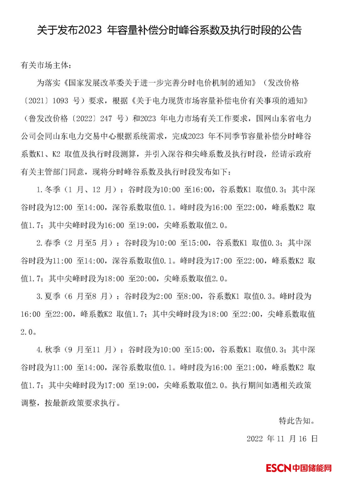 《關(guān)于發(fā)布2023 年容量補償分時峰谷系數(shù)及執(zhí)行時段的公告》原文如下: