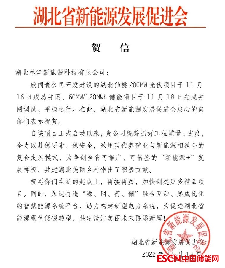 項(xiàng)目并網(wǎng)后,湖北省新能源發(fā)展促進(jìn)會(huì)第一時(shí)間發(fā)來(lái)賀信,充分肯定林洋項(xiàng)目對(duì)于湖北省新能源產(chǎn)業(yè)發(fā)展做出的積極貢獻(xiàn)!