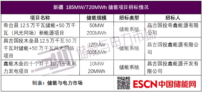 中國儲能網(wǎng)訊:日前,新疆昌吉國投旗下共有3個項目發(fā)布儲能系統(tǒng)招標公告,采購規(guī)模合計185MW/720MWh,如下表所示。