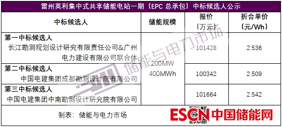 中國儲能網(wǎng)訊:近日,雷州市零碳產(chǎn)業(yè)園基礎(chǔ)設(shè)施建設(shè)項目- 雷州英利集中式共享儲能電站一期(EPC總承包)中標(biāo)候選人對外公示。長江勘測規(guī)劃設(shè)計研究有限責(zé)任公司&廣州電力建設(shè)有限公司聯(lián)合體以總報價101428萬元,折合單價2.536/Wh,成為第一中標(biāo)候選人。