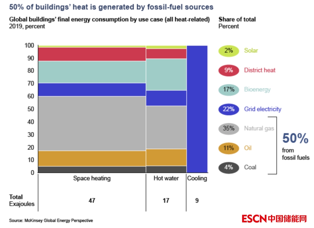要在2050年實現(xiàn)能源系統(tǒng)的凈零排放目標,熱能部門的脫碳至關重要,因為熱能部門的碳排放量目前約占所有能源相關碳排放的45%。