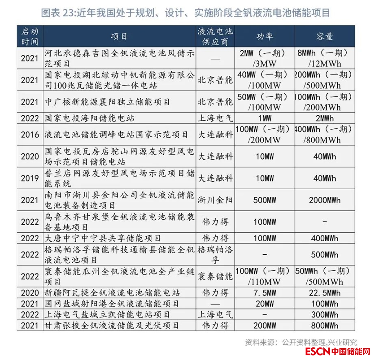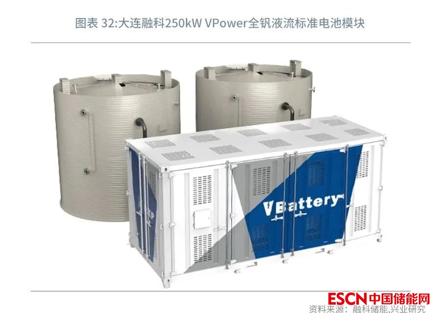 國內(nèi)全釩液流電池產(chǎn)業(yè)鏈基本形成。國內(nèi)聚焦于全釩液流電池及其材料的的公司主要有北京普能、大連融科、上海電氣、國網(wǎng)英大等電池代表企業(yè)和蘇州科潤、釩鈦股份、河鋼股份等上游配套企業(yè)。最早成立的北京普能,在全球累計(jì)實(shí)現(xiàn)全釩電池交付投運(yùn)達(dá)到70MWh,目前公司完成了C輪融資。大連融科,由中科院大連物理化學(xué)所孵化,目前有200 多項(xiàng)全釩電池相關(guān)專利,已在國內(nèi)外實(shí)施工程項(xiàng)目40余項(xiàng),國家級(jí)大型化學(xué)儲(chǔ)能示范項(xiàng)目大連100MW/400MWh全釩液流電池儲(chǔ)能調(diào)峰電站由其供貨,前者一期工程將于2022年6月并網(wǎng)調(diào)試,建成后將成為全球規(guī)模最大的全釩液流電池儲(chǔ)能電站。上海電氣已推出兆瓦級(jí)全釩液流電池,2021年9月,其1MW/1MWh釩液流電池儲(chǔ)能電站在廣東汕頭市濠江區(qū)風(fēng)電產(chǎn)業(yè)園順利通過驗(yàn)收。國網(wǎng)英大旗下的武漢南瑞,成功研發(fā)高功率全釩電池電堆和250kW/500kWh儲(chǔ)能系統(tǒng)。蘇州科潤、河鋼股份等全釩液流電池上游配套廠商近幾年陸續(xù)融資擴(kuò)產(chǎn),推動(dòng)液流電池整體成本不斷下降。
