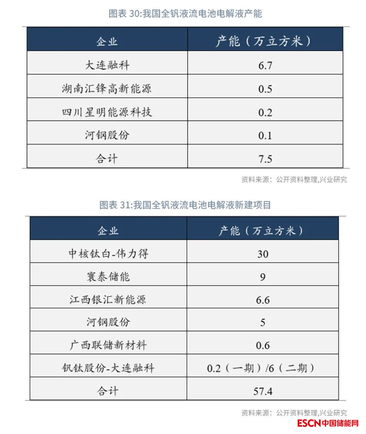 釩資源企業(yè)等積極入局全釩液流電池市場。我國全釩液流電池電解液產(chǎn)能約7.5萬立方米,主要的生產(chǎn)企業(yè)為大連融科,產(chǎn)能為6.7萬立方米。釩資源企業(yè)等積極布局釩電池電解液的制造,其中,中核鈦白與偉力得擬合作新建30萬立方米/年電解液項(xiàng)目,同時(shí)寰泰儲(chǔ)能、河鋼股份均有新建電解液的產(chǎn)能項(xiàng)目。目前,由于液流電池技術(shù)還集中在中游電堆制造企業(yè)手中,電解液生產(chǎn)多為電堆企業(yè)和釩資源企業(yè)合作,由電堆企業(yè)研發(fā)調(diào)配,委托釩資源企業(yè)代加工。