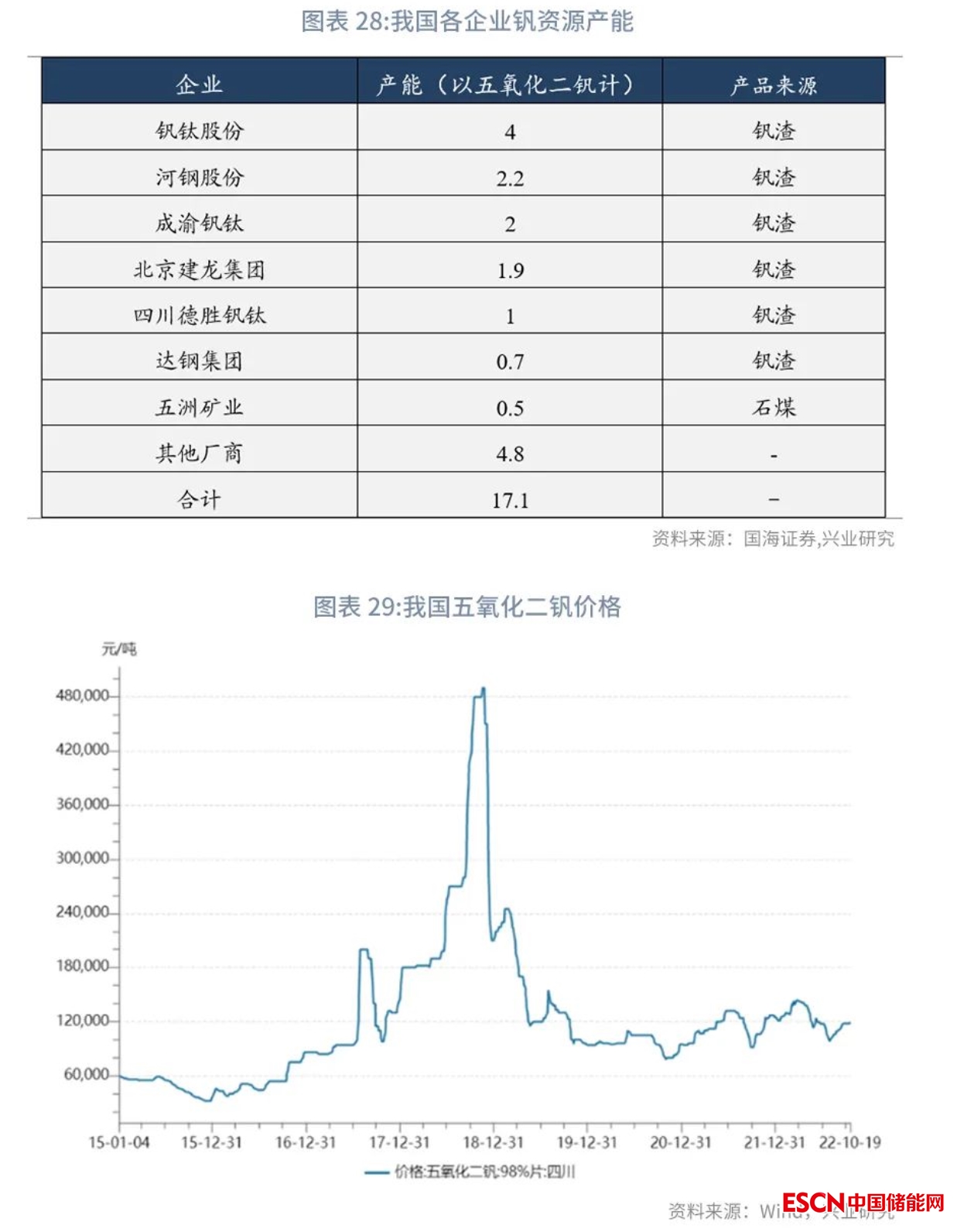 鋼鐵行業(yè)是釩主要下游應(yīng)用,全釩液流電池將打開釩資源需求空間,未來可能呈現(xiàn)供需趨緊。以五氧化二釩計(jì),2021年我國釩產(chǎn)能17.1萬噸,產(chǎn)量13.6萬噸,表觀消費(fèi)量13.5萬噸,其中95%以上應(yīng)用在鋼鐵領(lǐng)域,約3%應(yīng)用在鈦合金及化工行業(yè),其余約2%應(yīng)用在其他領(lǐng)域。每GWh全釩液流電池需要消耗8000噸五氧化二釩,預(yù)計(jì)2025年我國全釩液流電池新增裝機(jī)將達(dá)5.7GWh,對五氧化二釩的需求量將達(dá)4.6萬噸。隨著釩電池快速發(fā)展,打開釩需求增長新空間,由于我國釩產(chǎn)量主要來自釩鈦磁鐵礦經(jīng)鋼鐵冶金加工得到的釩渣,依賴鋼鐵行業(yè)發(fā)展,而我國鋼鐵行業(yè)需求趨于穩(wěn)定,預(yù)計(jì)將帶動(dòng)釩資源供需趨緊。