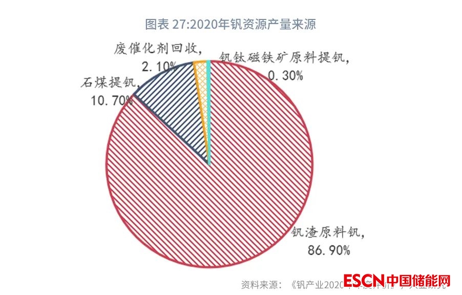 我國釩資源以釩鈦磁鐵礦和含釩石煤兩種形式存在,主要分布在四川攀枝花西昌地區(qū)和河北承德地區(qū)。釩的地殼豐度雖然較高,但卻主要與其他礦物形成共生礦或者復(fù)合礦,獨(dú)立釩礦較少見,我國釩資源以釩鈦磁鐵礦和含釩石煤兩種形式存在。國內(nèi)釩鈦磁鐵礦儲(chǔ)量主要分布在四川攀枝花西昌地區(qū)和河北承德地區(qū),其中四川攀枝花西昌地區(qū)已探明釩鈦磁鐵礦儲(chǔ)量在100億噸以上,河北承德地區(qū)已探明釩鈦磁鐵礦儲(chǔ)量超過80億噸。目前,我國約87%的釩來自于釩鈦磁鐵礦經(jīng)鋼鐵冶金加工得到的釩渣;約10.7%的釩由含釩石煤生產(chǎn)。