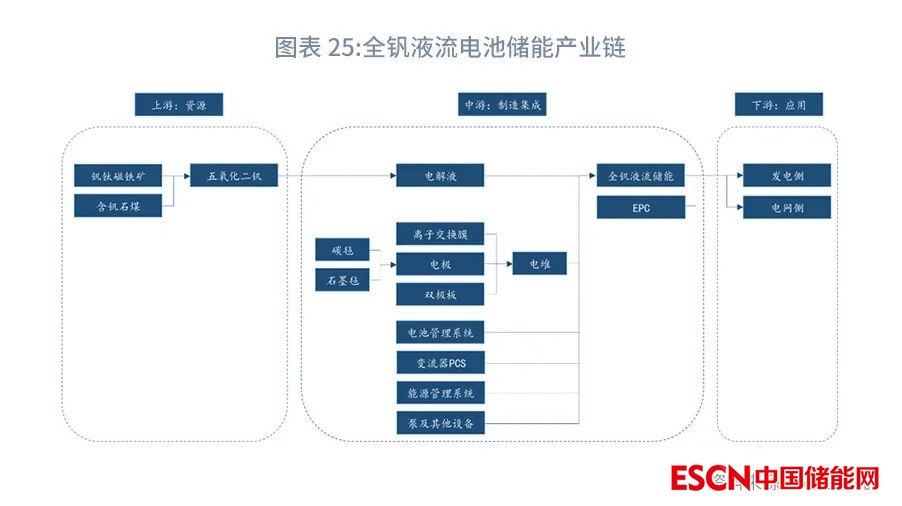 全釩液流電池產(chǎn)業(yè)鏈分為上游資源、中游制造集成和下游應(yīng)用三個(gè)環(huán)節(jié)。其中,上游為釩資源的開采與冶煉;中游為全釩液流電池儲(chǔ)能系統(tǒng)的制造、集成和EPC,主要環(huán)節(jié)為電解液、電堆研發(fā)制造;下游為全釩液流電池儲(chǔ)能項(xiàng)目的投資運(yùn)營。