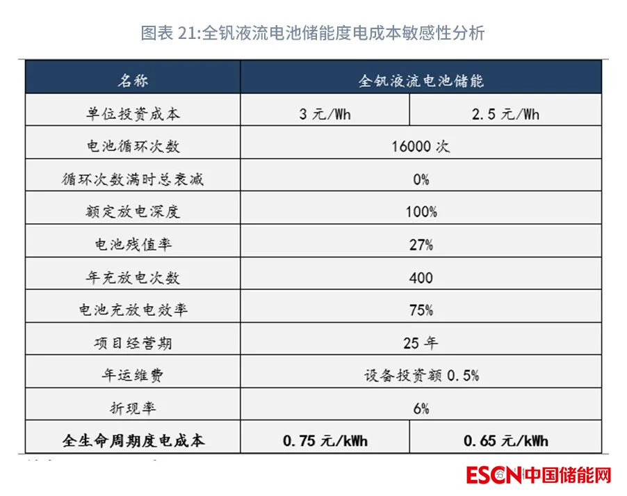 如果儲(chǔ)能時(shí)長提高至8h,或未來全釩液流電池成本繼續(xù)下降,度電成本或可低于鋰電儲(chǔ)能。假設(shè)未來4h全釩液流電池儲(chǔ)能EPC造價(jià)下降至2.5元/Wh,或者采用8h全釩液流電池儲(chǔ)能,其EPC總造價(jià)為2.5元/Wh,其他參數(shù)不變情況下,重新計(jì)算全釩液流電池全生命周期度電成本,其度電成本為0.62元/kWh,將有望與鋰電池0.65元/kWh度電成本媲美。