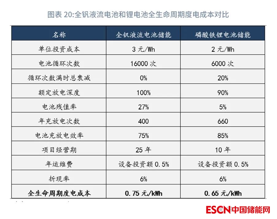 目前造價(jià)下,4h全釩液流電池儲(chǔ)能電站度電成本略高于鋰電儲(chǔ)能。目前4h全釩液流電池儲(chǔ)能電站設(shè)備造價(jià)約2.5元/Wh,按照EPC總造價(jià)3元/Wh考慮,年充放電次數(shù)按照400次考慮,則其全生命周期度電成本為0.75元/kWh,高于鋰電池0.65元/kWh度電成本。