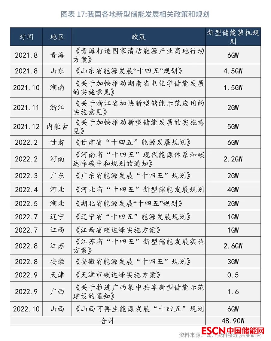 “十三五”以來,我國密集出臺(tái)產(chǎn)業(yè)政策和規(guī)劃鼓勵(lì)新型儲(chǔ)能發(fā)展。2021年10月,國務(wù)院印發(fā)《2030年前碳達(dá)峰行動(dòng)方案》,提出加快建設(shè)新型電力系統(tǒng),加快新型儲(chǔ)能示范推廣應(yīng)用,到2025年,新型儲(chǔ)能裝機(jī)容量達(dá)到3000萬千瓦以上。我國各省基于區(qū)域能源發(fā)展的切實(shí)需求以及帶動(dòng)新興產(chǎn)業(yè)發(fā)展的需求,相續(xù)發(fā)布“十四五”新型儲(chǔ)能發(fā)展目標(biāo)。目前,包括青海、山東、湖南等17省市自治區(qū)的“十四五”新型儲(chǔ)能規(guī)劃目標(biāo),新型儲(chǔ)能裝機(jī)規(guī)模合計(jì)已達(dá)4890萬千瓦,已遠(yuǎn)高于國家制定的3000萬千瓦的基礎(chǔ)目標(biāo)。