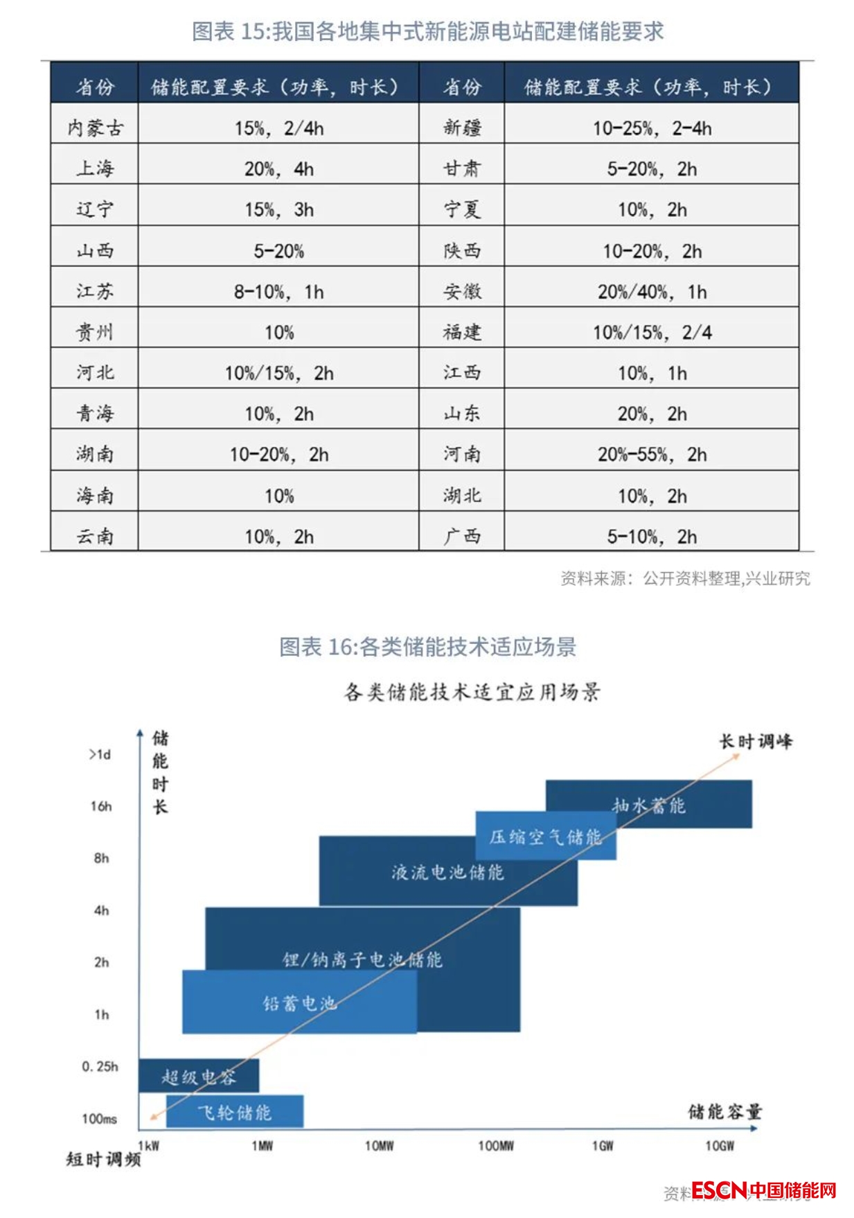 國家明確通過市場化方式落實(shí)并網(wǎng)條件的可再生能源發(fā)電項(xiàng)目需配置4小時(shí)儲(chǔ)能系統(tǒng),新疆、內(nèi)蒙古等地已開始執(zhí)行該政策。2021年7月,國家發(fā)改委、國家能源局發(fā)布《關(guān)于鼓勵(lì)可再生能源發(fā)電企業(yè)自建或購買調(diào)峰能力增加并網(wǎng)規(guī)模的通知》提出,在電網(wǎng)企業(yè)承擔(dān)風(fēng)電和太陽能發(fā)電等可再生能源保障性并網(wǎng)責(zé)任以外,仍有投資建設(shè)意愿的可再生能源發(fā)電企業(yè),鼓勵(lì)在自愿的前提下自建儲(chǔ)能或購買調(diào)峰資源增加并網(wǎng)規(guī)模,保證新建項(xiàng)目按照不低于功率15%、時(shí)長4小時(shí)的要求配置調(diào)峰能力,對于配置20%以上調(diào)峰能力的項(xiàng)目優(yōu)先并網(wǎng)。目前,我國各地依據(jù)自身新能源占比以及電力調(diào)節(jié)能力,來制定各自的新能源配儲(chǔ)比例和時(shí)長,新疆、內(nèi)蒙古、以及上海金山海上風(fēng)電已要求配置4h儲(chǔ)能。