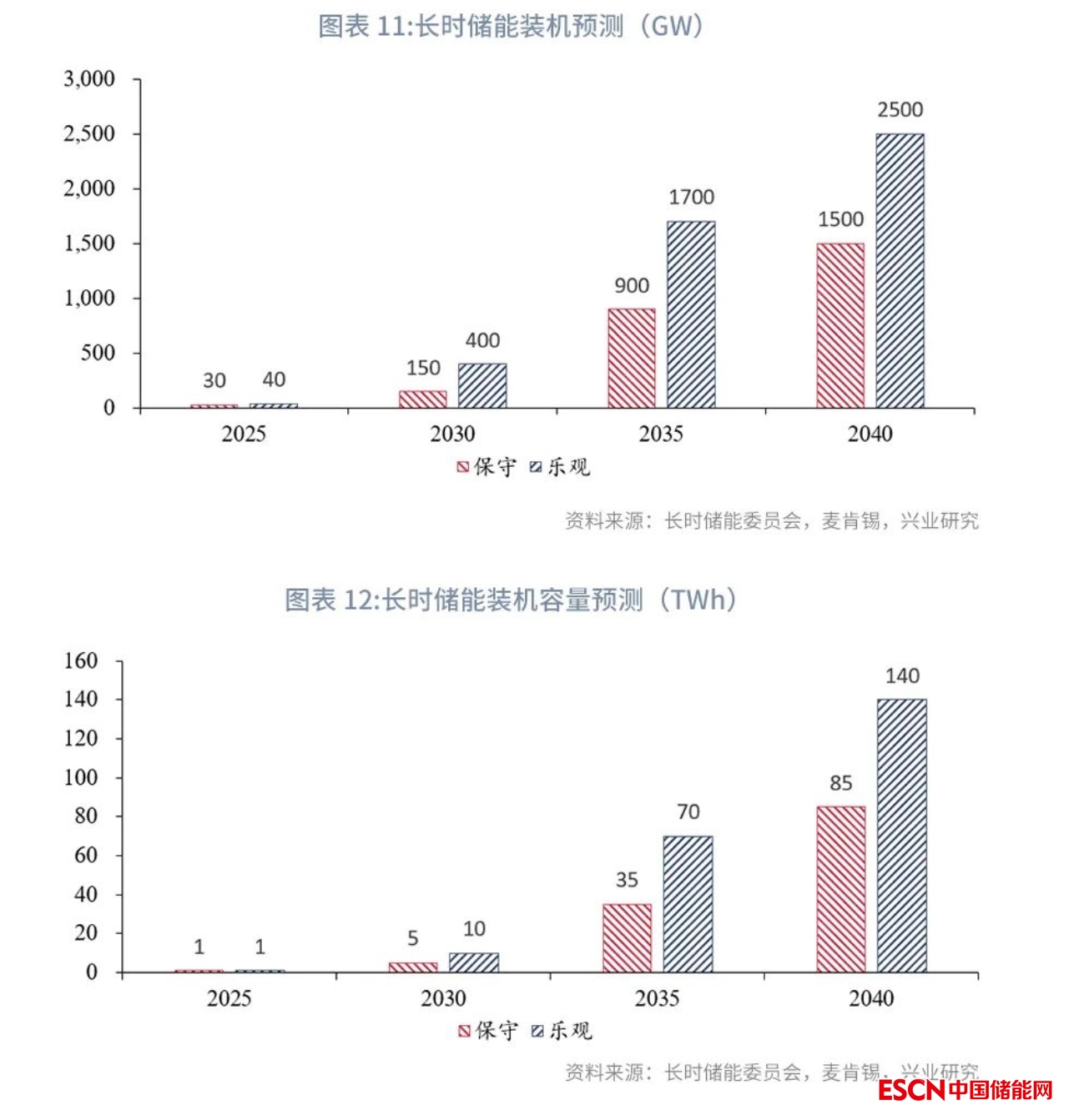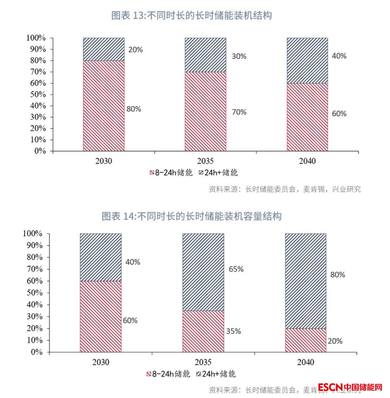 長時(shí)儲(chǔ)能委員會(huì)與麥肯錫聯(lián)合發(fā)布《Net-zero power:Long duration energy storage for a renewable grid》(2021年11月)提出長時(shí)儲(chǔ)能將于2025年開始大規(guī)模增長。報(bào)告指出全球已投入運(yùn)營或已宣布部署的8h及以上長時(shí)儲(chǔ)能系統(tǒng)超過5GW和65GWh,全球已公示超過230個(gè)處于不同商業(yè)階段的長時(shí)儲(chǔ)能項(xiàng)目(不包括抽水蓄能)。報(bào)告預(yù)計(jì),隨著可再生能源滲透率提升,2025年長時(shí)儲(chǔ)能全球累計(jì)裝機(jī)量將達(dá)到30—40GW/1TWh;2030年起全球可再生能源滲透率將升至60%—70%,長時(shí)儲(chǔ)能累計(jì)裝機(jī)量將達(dá)到150—400GW/5—10TWh;同時(shí),報(bào)告提出,到2030年,預(yù)計(jì)儲(chǔ)能時(shí)長在24小時(shí)以上的儲(chǔ)能占比將快速提升,8-24小時(shí)的儲(chǔ)能裝機(jī)量可能占長時(shí)儲(chǔ)能裝機(jī)量的80%和總儲(chǔ)能容量的60%。