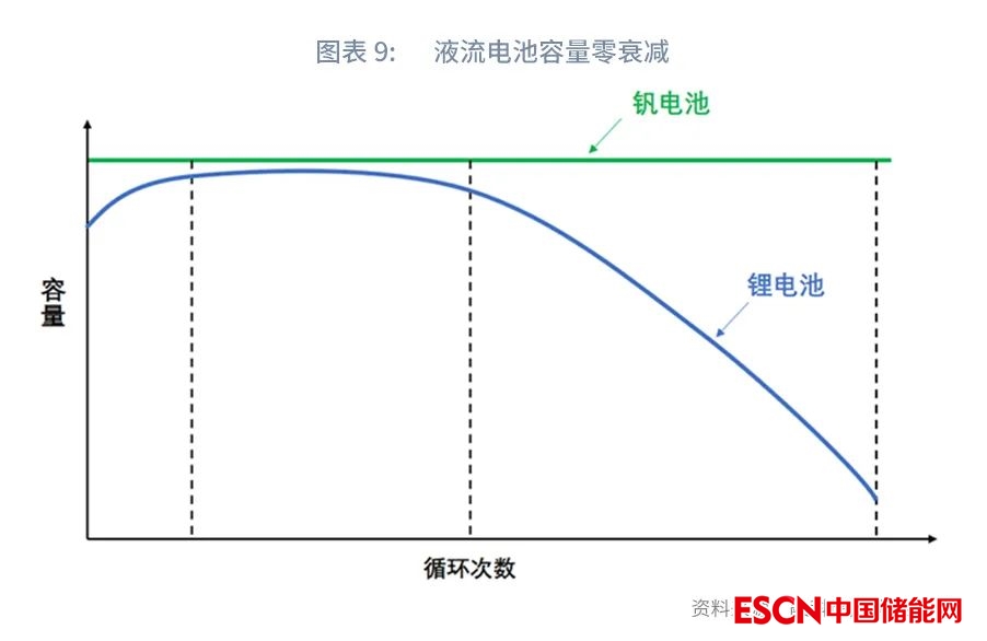 由于全釩液流電池正負(fù)活性物質(zhì)分別儲(chǔ)存在正負(fù)電解液儲(chǔ)槽中,避免了正負(fù)活性物質(zhì)的自放電消耗,滿充后可長期保持,極低的自放電率,幾乎可以忽略不計(jì)。而鋰電池自放電率約0.1-0.3%/天。