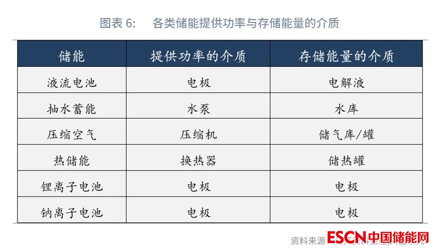 不同儲(chǔ)能技術(shù),提供功率和存儲(chǔ)能量的介質(zhì)有解耦和非解耦之分。相比鋰離子電池和鈉離子電池提供功率的介質(zhì)即為貯存能量的介質(zhì),液流電池儲(chǔ)能、抽水蓄能、壓縮空氣儲(chǔ)能和熱儲(chǔ)能提供功率的介質(zhì)和存儲(chǔ)能量的介質(zhì)是解耦的,配置更為靈活、且利于降本。