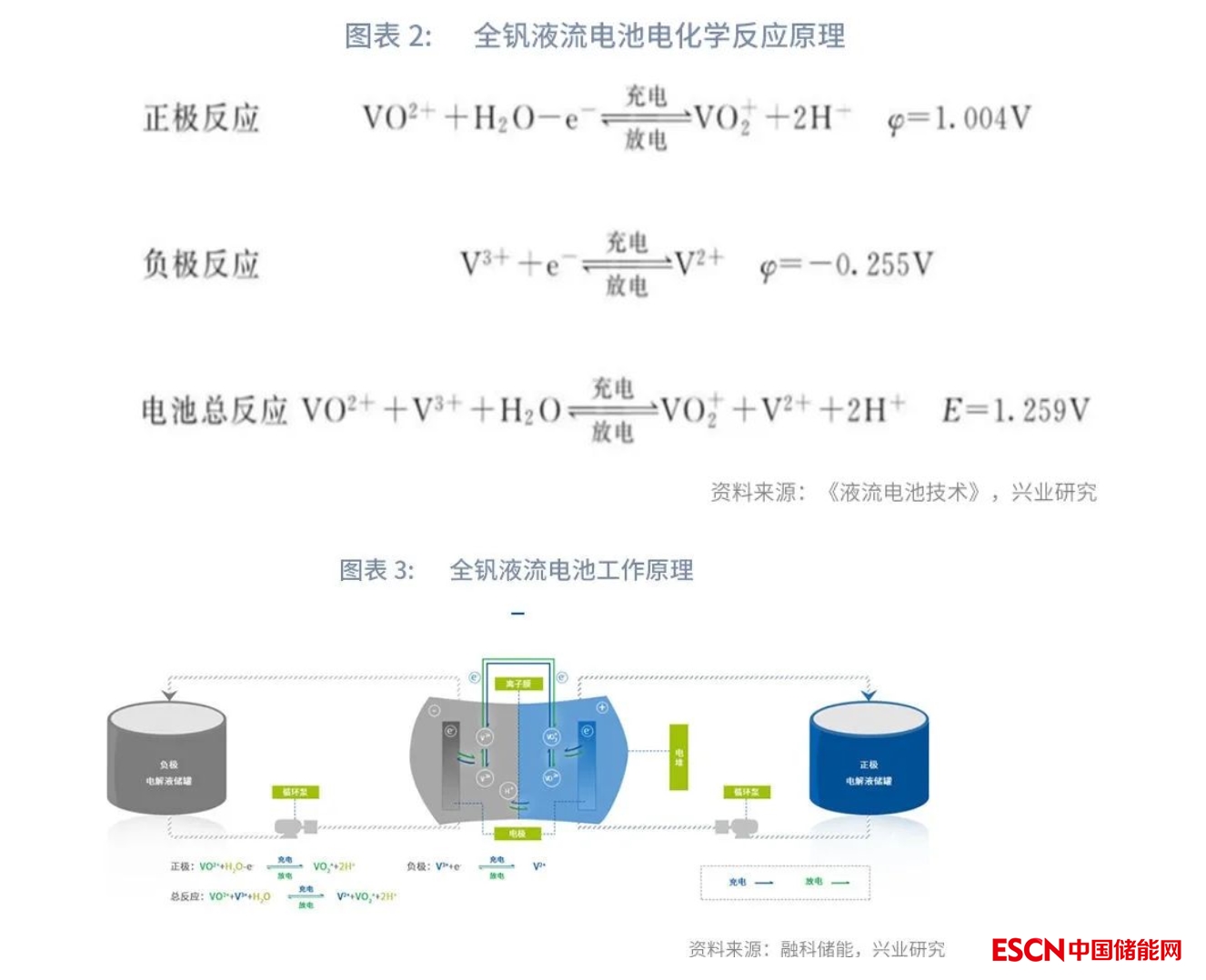 全釩液流電池是一種以金屬釩離子為活性物質(zhì)的液態(tài)氧化還原可再生電池。全釩液流電池以+4、+5價(jià)態(tài)的釩離子溶液作為正極的活性物質(zhì),以+2、+3價(jià)態(tài)的釩離子溶液作為負(fù)極的活性物質(zhì),分別儲(chǔ)存在正、負(fù)極電解液儲(chǔ)罐中。在對電池進(jìn)行充、放電時(shí),正負(fù)極電解液在離子交換膜兩側(cè)進(jìn)行氧化還原反應(yīng)。同時(shí),通過電堆外循環(huán)泵的作用,儲(chǔ)液罐中的電解液不斷送入正極室和負(fù)極室內(nèi),以維持離子的濃度,實(shí)現(xiàn)對電池的充放電。全釩液流電池在充放電過程中,主要依靠電解液中H+在離子膜上的定向移動(dòng)形成電流回路。全釩液流電池在電堆內(nèi)部發(fā)生氧化還原反應(yīng),其化學(xué)反應(yīng)方程式如下,開路電壓為1.259V。