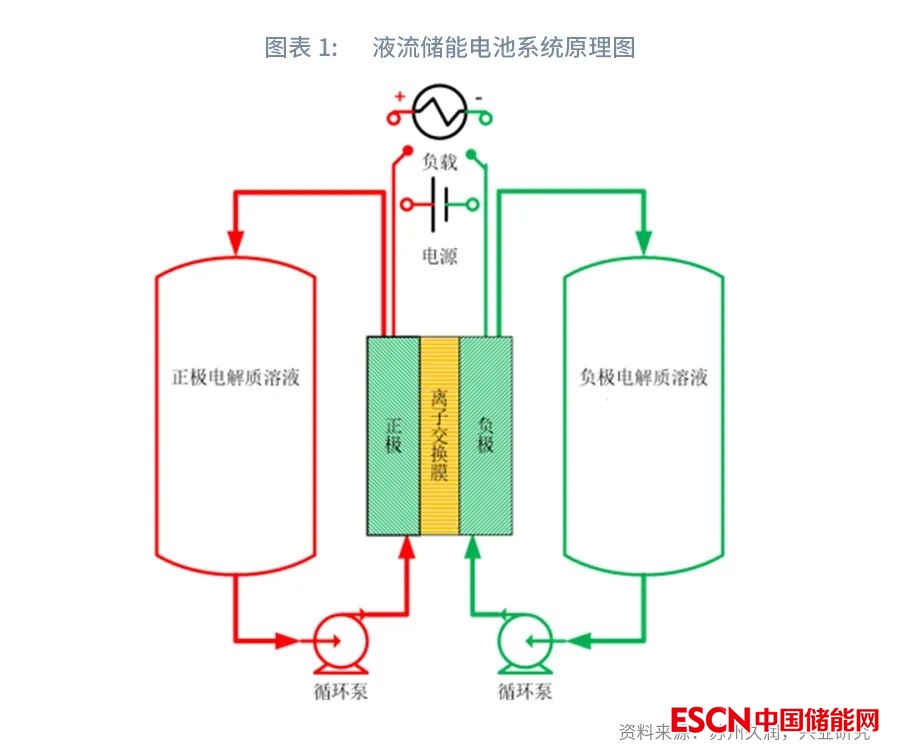 液流電池工作原理為通過外接泵與交換膜實(shí)現(xiàn)電化學(xué)反應(yīng)。液流電池的正、負(fù)極電解液儲(chǔ)罐是完全獨(dú)立分離放置在堆棧外部的,通過兩個(gè)循環(huán)動(dòng)力泵將正、負(fù)極電解液通過管道泵入液流電池堆棧中并持續(xù)發(fā)生電化學(xué)反應(yīng),通過將化學(xué)能與電能進(jìn)行相互轉(zhuǎn)換作用來完成電能的儲(chǔ)存和釋放。