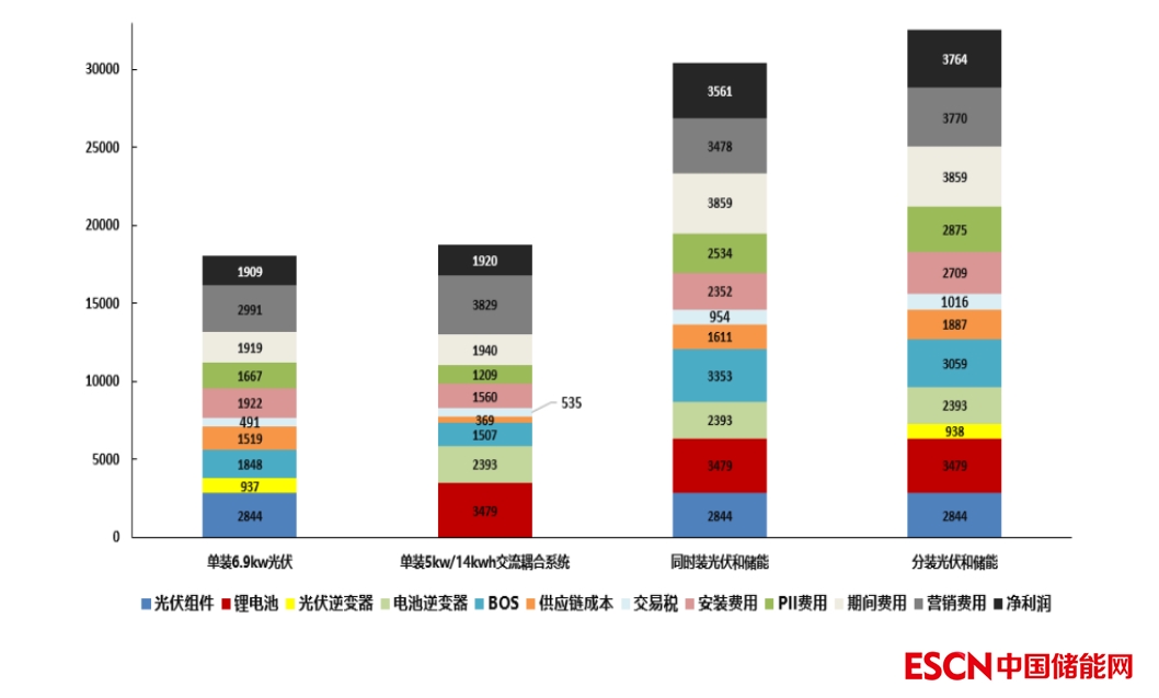 從終端用戶維度考慮,用戶在安裝戶用儲能系統(tǒng)時,除了光伏組件、電池以及逆變器外,還需要支付許可審查費、期間費用、營銷費用等成本。