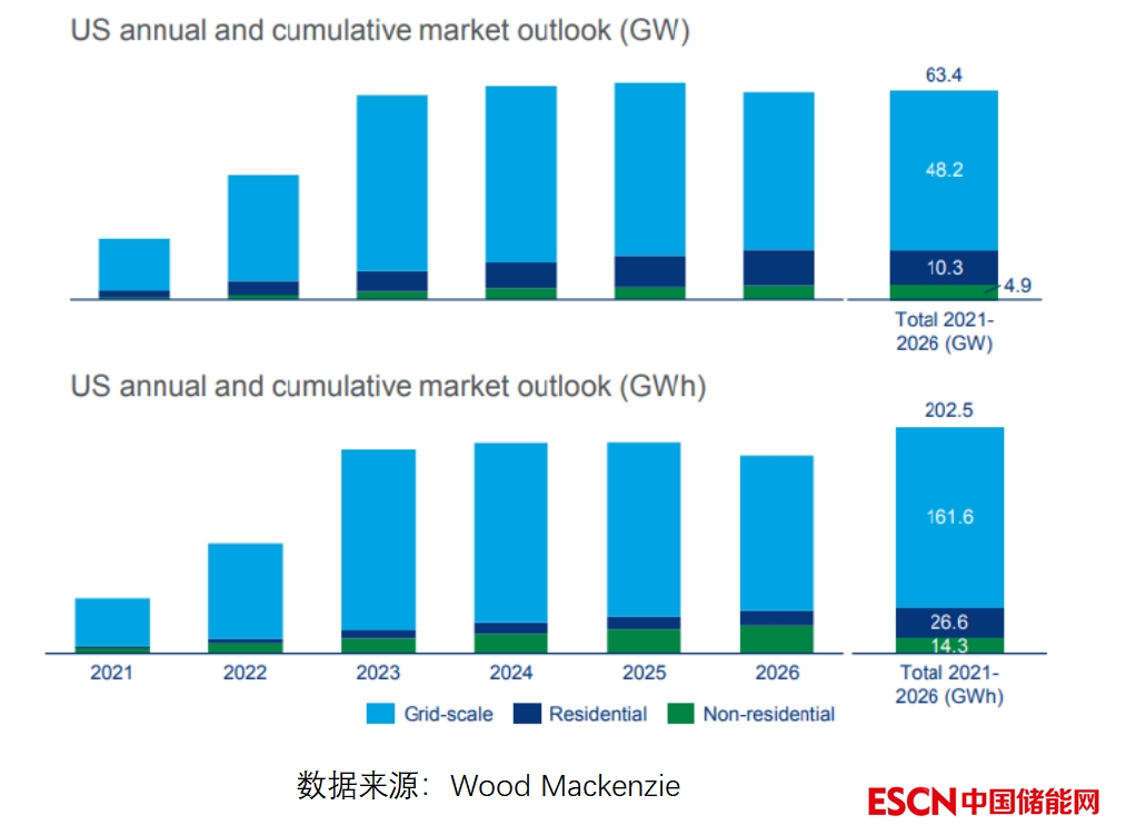 預(yù)計美國儲能2021-2026年總新增裝機規(guī)模將達到63.4GW/202.5GWh,其中戶用儲能裝機規(guī)模達到4.9GW/14.3GWh。