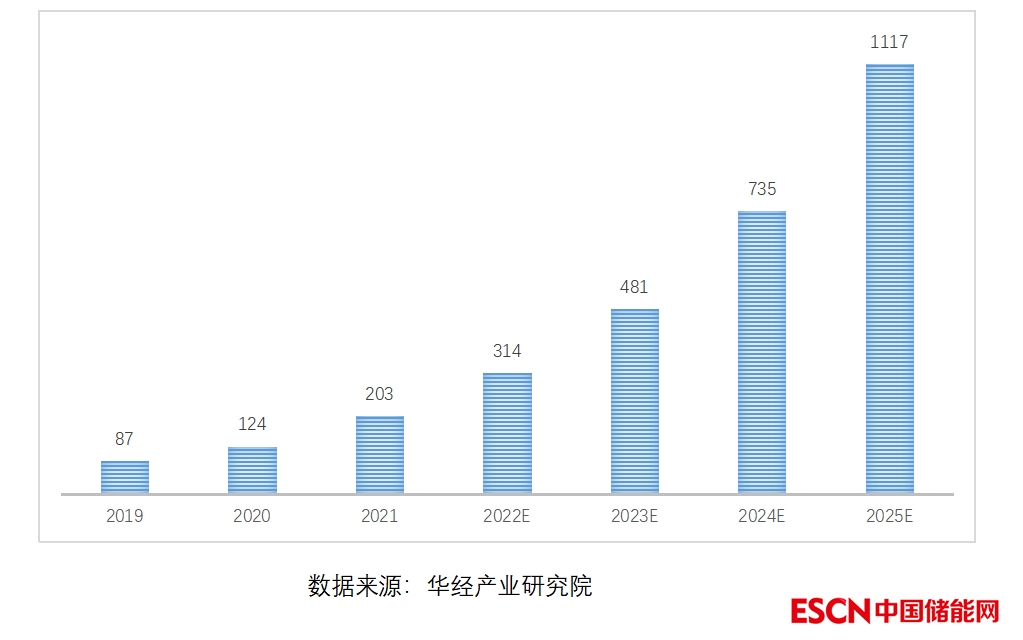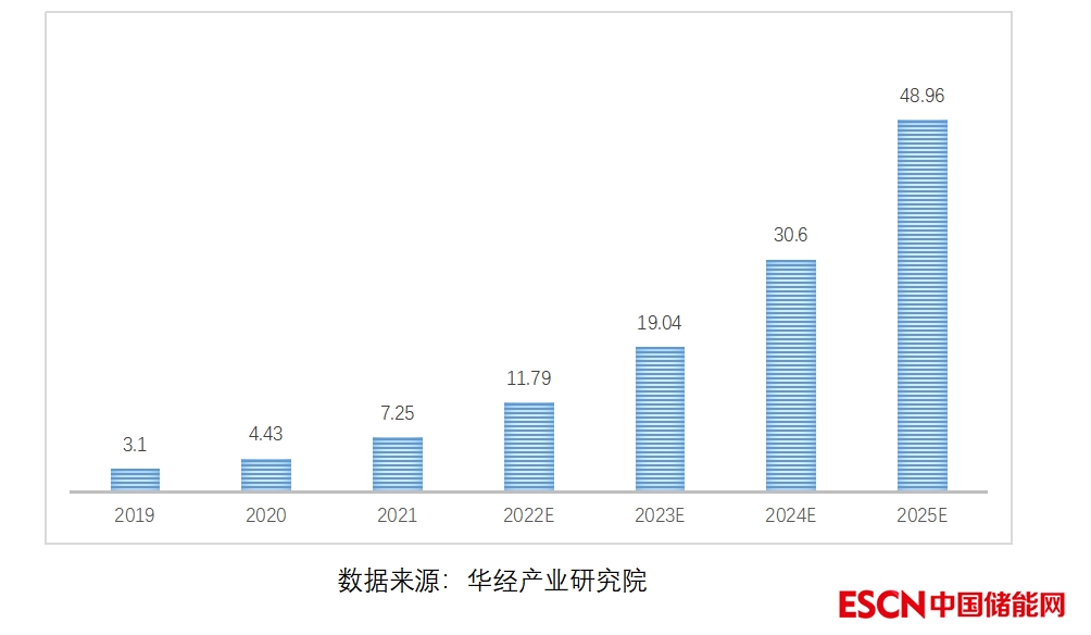 根據(jù)華經(jīng)產(chǎn)業(yè)研究院預(yù)測,全球戶用儲能平均需求增速超過60%,2025年新增裝機需求達到48GWh。一套完整的家用儲能系統(tǒng)包括電池系統(tǒng)、逆變器、企業(yè)零部件,2021年戶用儲能平均硬件成本約為2.8元/wh,按照儲能系統(tǒng)平均5%成本下降預(yù)測,預(yù)計2025年戶用儲能行業(yè)規(guī)模約為1117億元人民幣。