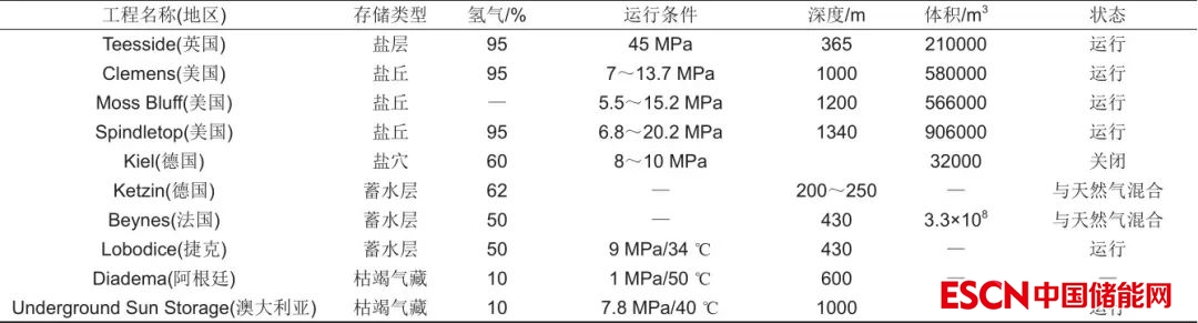 1976年Walters驗(yàn)證了利用自然形成的地下結(jié)構(gòu)來儲存氫氣具有可行性。1979年Carden等研究了地下儲氫的流失率,他們發(fā)現(xiàn)每個注采循環(huán)周期約有1%氫氣可能會損失,而在第1個循環(huán)中,氫氣溶解到地層中造成的損耗只有0.4%。1986年Taylor等通過評估氫氣儲存在鹽穴、巖石穴的可行性及經(jīng)濟(jì)性,研究發(fā)現(xiàn)鹽穴是最經(jīng)濟(jì)的地下儲存結(jié)構(gòu)。2018年Tarkowski等在波蘭篩選了28個鹽穴,為地下儲氫選出了最有價值的7個鹽穴。同年,Heinemann等根據(jù)存儲容量和地質(zhì)條件,研究了在英國中部的地下儲氫的可能性。Lemieux等在2019年分析了枯竭的油氣藏儲氣庫、鹽穴儲氣庫、含水層儲氣庫等優(yōu)勢,并把鹽穴用于季節(jié)性儲存加拿大安大略省的氫氣。Lankof等在2020年提供了一系列具有地下儲氫潛力的鹽穴。Narayanamoorthy等參照運(yùn)營技術(shù)、投資成本、社會、經(jīng)濟(jì)、風(fēng)險因素等5個標(biāo)準(zhǔn),提出了地下儲氫鹽穴選址方法。隨著研究的深入,越來越多的目光聚焦在大規(guī)模地下鹽穴儲氫項(xiàng)目上。氫氣儲氣庫的墊層氣以甲烷為主,但氫氣和甲烷兩種氣體易形成氣體混合,采出氫氣時會同時采出一定量的甲烷,影響氫氣的采出純度。如表2所示,世界上地下存儲純度較高的氫氣(氫氣純度≥95%)的設(shè)施大多建立在英國和美國,它們大部分選擇鹽穴作為儲氫地點(diǎn)。比如位于英國Teesside的儲氫工程證明鹽穴是一個完美的儲氫場所,但是它的運(yùn)行壓力較低,且Teesside的儲氫工程深度僅為356 m,運(yùn)行壓力低會導(dǎo)致鹽穴塌陷,所以需要已注入的大部分氫氣維持壓力,故循環(huán)采出的氫氣量較小,采出氫氣的體積占總體積的8%。在表2中,還有許多氫氣與其他氣體(例如甲烷)混合的儲存項(xiàng)目,這說明利用氫氣地下大規(guī)模儲存并轉(zhuǎn)化成另一種形式能源的研究引起了世界各國的極大關(guān)注。