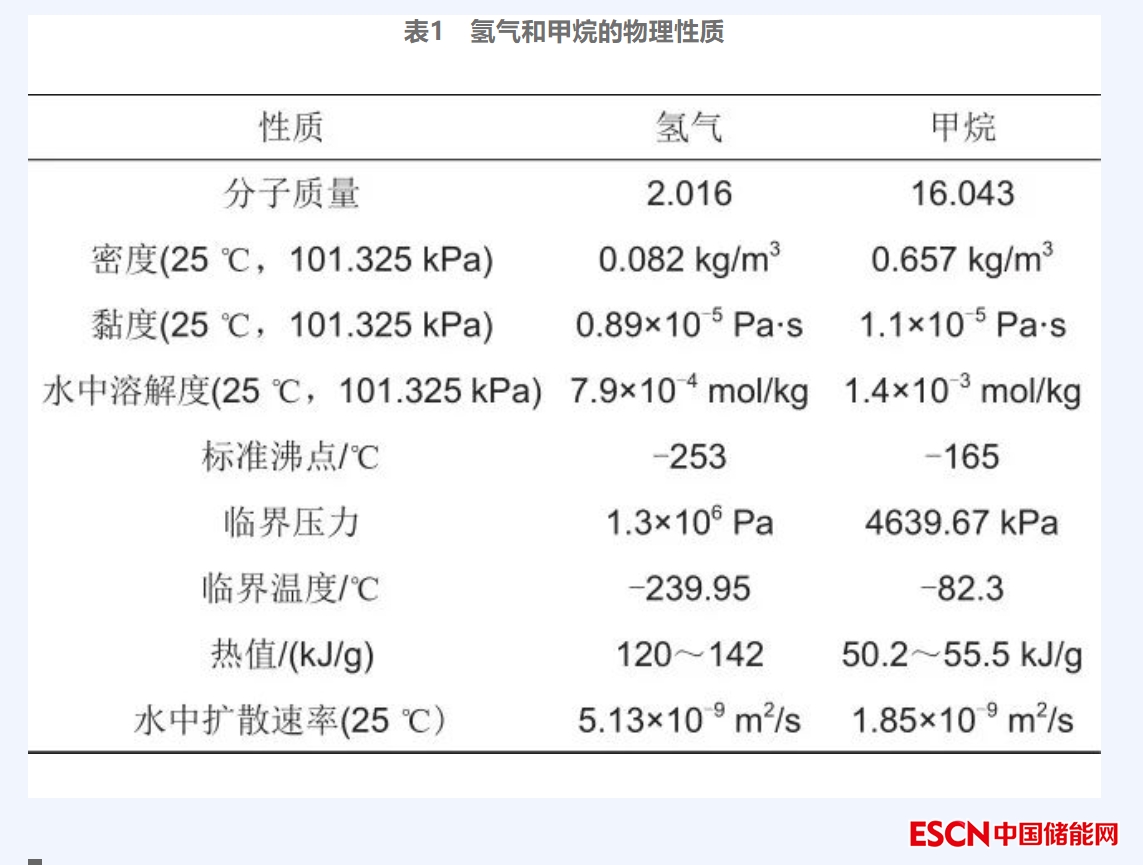 一般情況下,氫氣的能量密度約為120 MJ/kg,它的能量密度是天然氣的2.5~3.0倍,是單位質(zhì)量中能量含量最高的燃料。我國地下儲氫研究較為滯后,尚無地下鹽穴儲氫實(shí)踐。但是天然氣地下儲氣庫在國內(nèi)已實(shí)現(xiàn)大規(guī)模推廣,在建設(shè)和運(yùn)營方面可以為氫氣儲運(yùn)提供成熟經(jīng)驗(yàn)與借鑒。氫氣在物理性質(zhì)上和甲烷大有不同,見表1。在25 ℃、101.325 kPa氣壓下,氫氣的密度僅為0.082 kg/m3,甲烷在室溫下密度是氫氣的8倍,在質(zhì)量相同情況下氫氣需要更高的儲存壓力。氫氣的黏度同樣也比甲烷小,表現(xiàn)出更高的流動性,這會導(dǎo)致氫氣在地下采出過程中的殘留變低,注采效率與天然氣相比會有所提高。在水溶性方面,氫氣在水中的溶解度也比甲烷低,這意味著氫氣在注氣排鹵過程中會有更少的損失。以典型的地下鹽穴存儲體系為例,在水-氫-鹽三相系統(tǒng)中,可通過調(diào)節(jié)溫度、壓力、鹽水濃度等參數(shù),進(jìn)一步降低氫在鹽水中的溶解度。但是,由于氫氣的分子量較低,擴(kuò)散程度較高,它很可能通過蓋層和夾層向地表或四周泄漏。在標(biāo)準(zhǔn)狀態(tài)下,氫氣的水中擴(kuò)散系數(shù)是甲烷的2.77倍。因此在地下存儲過程中,必須考慮地下空間孔隙度對擴(kuò)散的影響。綜上所述,在借鑒成熟經(jīng)驗(yàn)時應(yīng)考慮到實(shí)際工程應(yīng)用中儲存氫氣壓力、注采工藝、滲透率等因素與儲存天然氣的差異,意識到氫氣地下存儲研究的科學(xué)問題和技術(shù)挑戰(zhàn)。