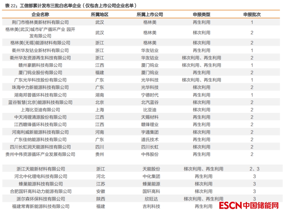 共計(jì) 45 家企業(yè)入選“白名單”,行業(yè)規(guī)范化發(fā)展可期。依據(jù)《新能源汽車廢舊動(dòng)力蓄電池綜合利用行業(yè)規(guī)范條件》(2019 年本),工信部分別從企業(yè)布局與項(xiàng)目選址、技術(shù)裝備與工藝、資源綜合利用及能耗、環(huán)境保護(hù)、產(chǎn)品質(zhì)量和職業(yè)教育、安全生產(chǎn)與職工健康六個(gè)方面對(duì)動(dòng)力電池綜合利用企業(yè)的提出了規(guī)范要求,企業(yè)可依照規(guī)范條例進(jìn)行自主申報(bào)。截至 2022 年 7 月,工信部累計(jì)發(fā)布了三批符合《新能源汽車廢舊動(dòng)力蓄電池綜合利用行業(yè)規(guī)范條件》企業(yè)名單,合計(jì) 45 家動(dòng)力蓄電池綜合利用企業(yè)。
