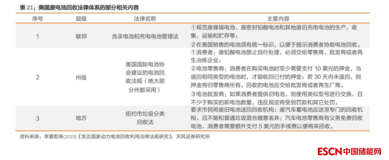 美國:以生產(chǎn)者延伸責(zé)任制為原則,實(shí)施汽車電池押金制度。相較于歐盟對(duì)各回收環(huán)節(jié)的責(zé)任進(jìn)行嚴(yán)格立法,美國更傾向于采用市場(chǎng)調(diào)節(jié)的方式進(jìn)行管理約束。首先,美國同樣確立了以生產(chǎn)者責(zé)任延伸為原則的回收體系:1)電池生產(chǎn)者在生產(chǎn)電池的時(shí)候要建立統(tǒng)一標(biāo)識(shí),以便于回收再利用;2)美國電池生產(chǎn)商需負(fù)責(zé)組織回收這些廢舊電池,并對(duì)此承擔(dān)相關(guān)責(zé)任。除此之外,美國國際電池協(xié)會(huì)還設(shè)立了押金制度,規(guī)定消費(fèi)者在購買汽車電池時(shí)必須繳納電池押金,以促使消費(fèi)者后續(xù)主動(dòng)上交廢舊電池產(chǎn)品。最后,政府會(huì)在廢舊電池回收企業(yè)和電池制造企業(yè)間構(gòu)建經(jīng)濟(jì)協(xié)作關(guān)系,并過協(xié)議價(jià)格引導(dǎo)電池生產(chǎn)企業(yè)履行生產(chǎn)商的責(zé)任,并確保廢舊電池回收企業(yè)獲得利潤(rùn)。