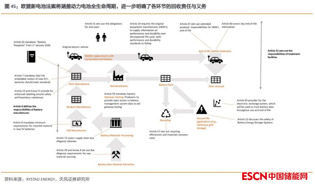 此外,為應(yīng)對(duì)退役規(guī)模日益擴(kuò)大的動(dòng)力電池,歐盟還于近日通過了新電池法案,對(duì)動(dòng)力電池的全生命周期進(jìn)行了完整的規(guī)劃,進(jìn)一步明確了各環(huán)節(jié)的回收責(zé)任與義務(wù),確保了產(chǎn)業(yè)鏈的穩(wěn)定、可控。