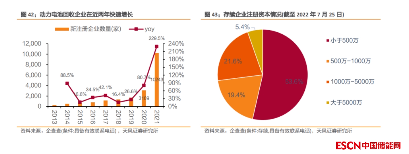 (2) 存續(xù)企業(yè)以“小作坊”為主,行業(yè)無序競(jìng)爭(zhēng)問題嚴(yán)峻。截至 2022 年 7 月 25 日,我國存續(xù)動(dòng)力電池回收企業(yè)共 14265 家,其中注冊(cè)資本小于 500 萬的企業(yè)有 7646 家,占比高達(dá) 53.60%,行業(yè)呈現(xiàn)“小、散、亂”的發(fā)展現(xiàn)狀。另一方面,行業(yè)還面臨著比較嚴(yán)峻的無序競(jìng)爭(zhēng)問題,當(dāng)前急需進(jìn)一步規(guī)范,許多 “小作坊”企業(yè)以放棄環(huán)保為代價(jià)開展不正當(dāng)競(jìng)爭(zhēng),導(dǎo)致大量退役電池流向了非正規(guī)渠道,給環(huán)境造成了較大壓力。