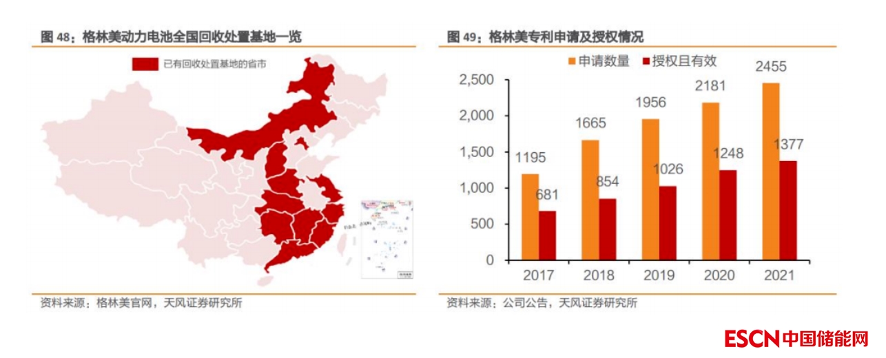 研發(fā)能力卓越,電池回收技術(shù)領(lǐng)先。公司 2021 年在廢物循環(huán)與新能源材料制造領(lǐng)域累計(jì)申請(qǐng)專利 2455項(xiàng),位居“2021 年中國上市公司(滬 A 深 A)專利實(shí)力 500 強(qiáng)”榜單第 206 位。電池回收利用技術(shù)方面,公司鋰回收率超過 90%,鎳、鈷、錳的回收率均超過 99%,處于行業(yè)領(lǐng)先水平。
